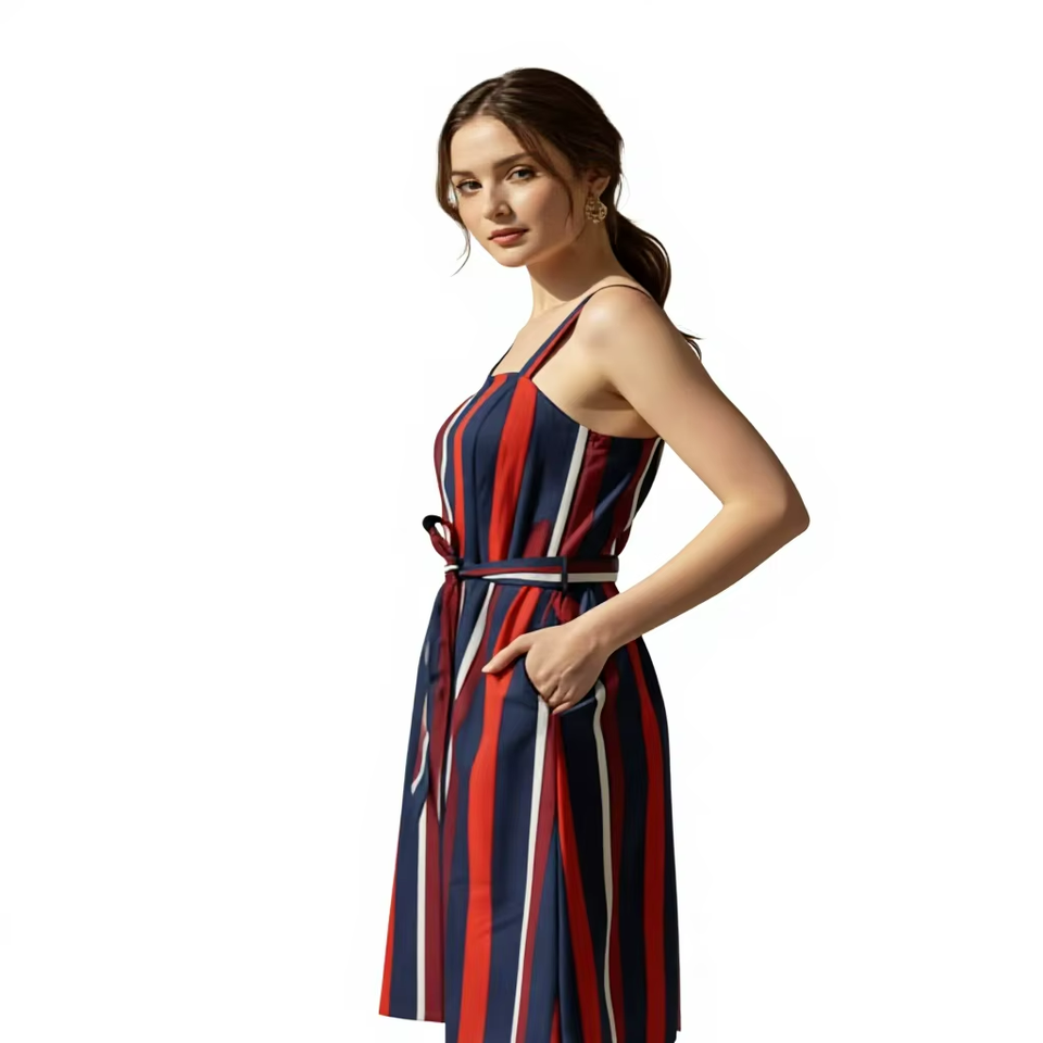 เดรสทรงเอไลน์พิมพ์ลาย สายเดี่ยวเรียบง่ายทันสมัยสำหรับผู้หญิง ผ้าโพลีเอสเตอร์ 100% สวมใส่สบาย ระบายอากาศได้ดี แต่งกระดุม