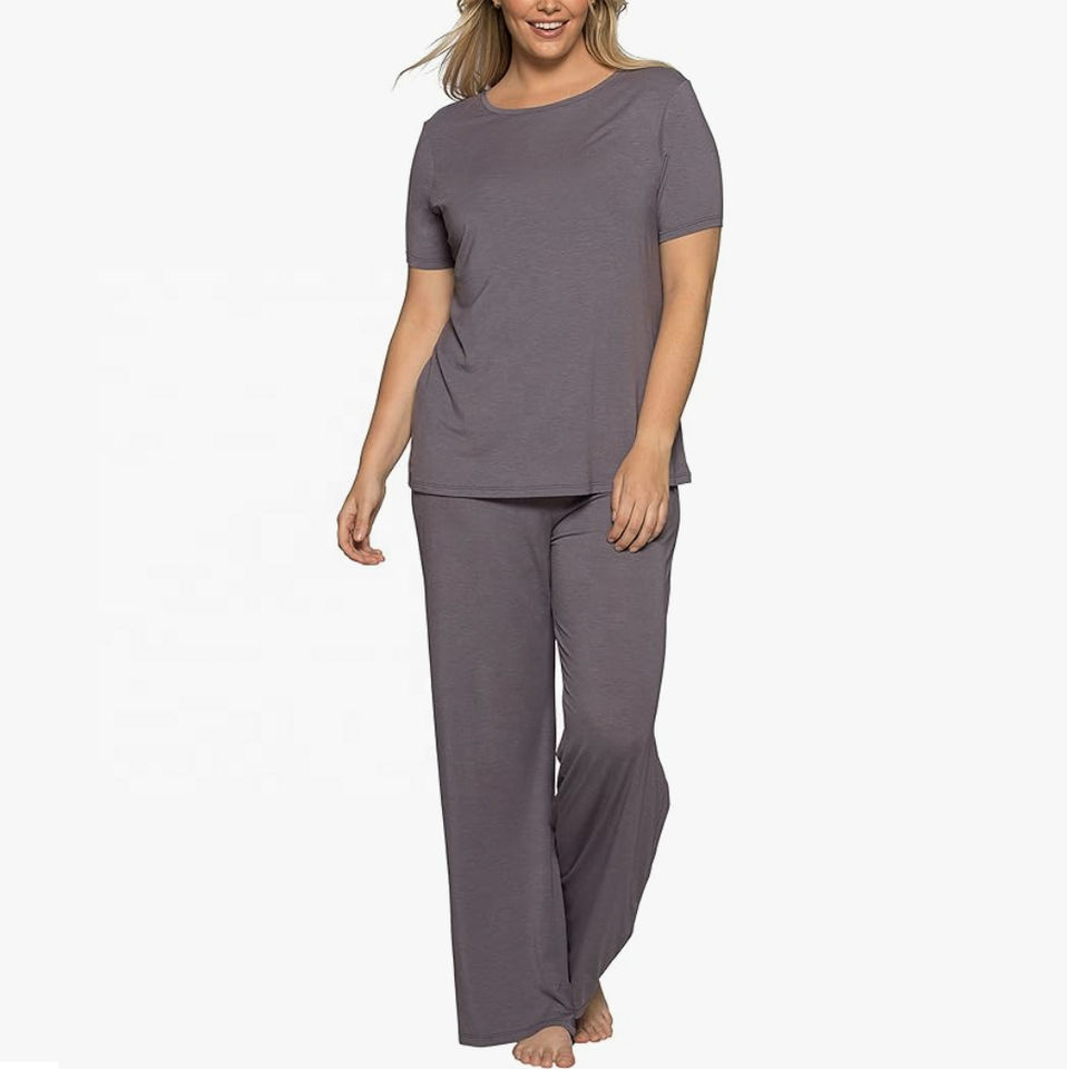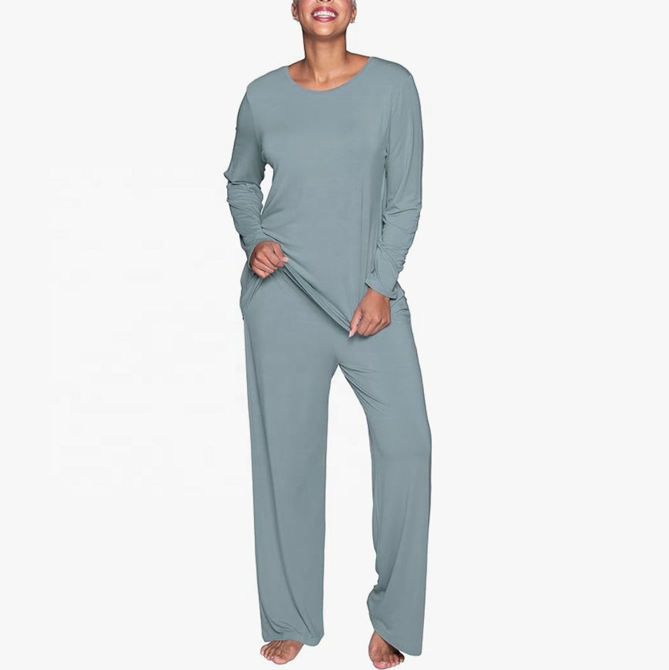 ชุดนอนผู้หญิง ชุดนอนผ้าฝ้ายผสมโพลีเอสเตอร์เนื้อนุ่มสบาย ชุดนอนเสื้อเจอร์ซีย์คอกลมและกางเกงขายาวผ้าสักหลาดสำหรับผู้หญิง บริการ OEM
