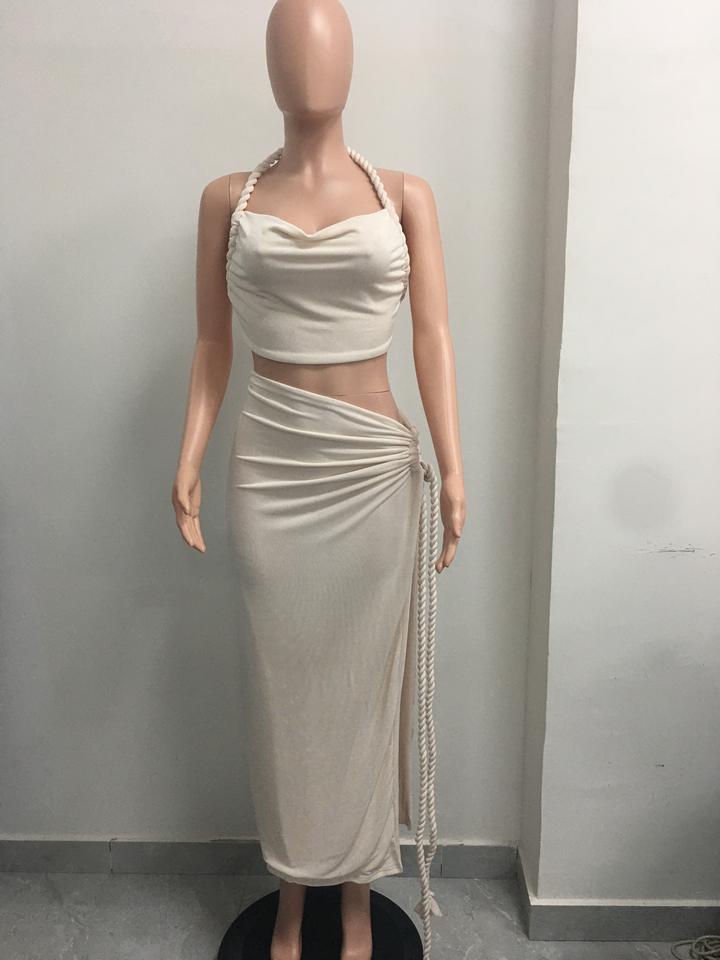 ชุดเซ็ต 2 ชิ้น เสื้อแขนกุดผูกคอพร้อมกระโปรงผูกเอวเชือกป่าน ดีไซน์เซ็กซี่ แฟชั่นสำหรับผู้หญิง