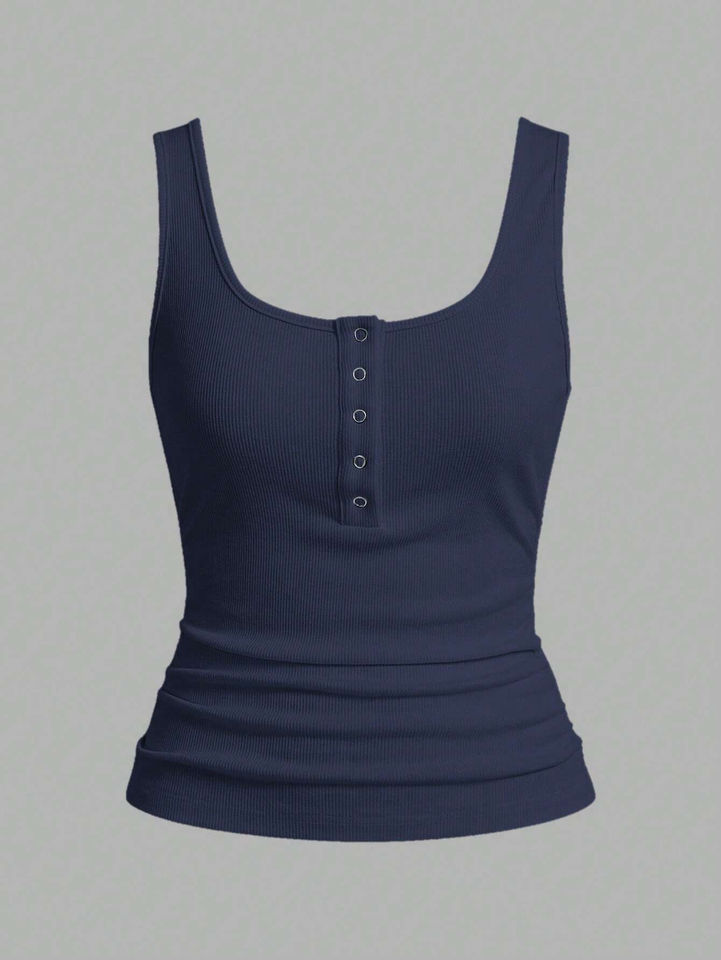 เสื้อกล้ามถักแขนกุดสำหรับผู้หญิงเสื้อกล้ามลำลองคอกลมสีทองมีกระดุมแบบเรียบทันสมัยใหม่