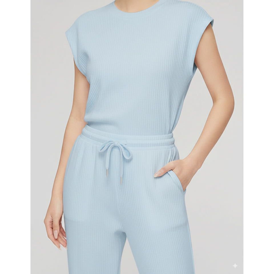 ชุดเซ็ตเสื้อกล้ามถักลายริบและกางเกงขาสั้นสำหรับผู้หญิง ผ้าฝ้าย 100% ระบายอากาศได้ดี เนื้อผ้านุ่ม ใส่สบาย เหมาะสำหรับใส่ที่บ้านหรือลำลอง