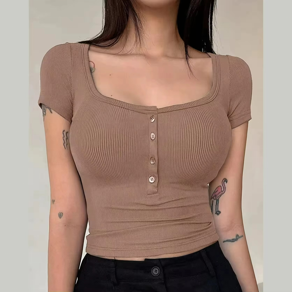 เสื้อยืดแขนสั้นทรงเข้ารูปสำหรับผู้หญิง ผ้าริบถักแบบลำลอง ตัดเย็บแบบเว้าช่วงตัว เสื้อพูลโอเวอร์เรียบง่ายสำหรับฤดูร้อน