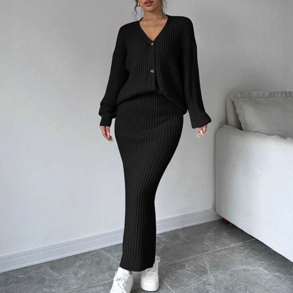 ชุดเซ็ตแฟชั่น 2 ชิ้น เสื้อคาร์ดิแกนแขนยาวสีพื้นลำลองสำหรับผู้หญิง และกระโปรง สำหรับฤดูใบไม้ร่วง/ฤดูหนาว