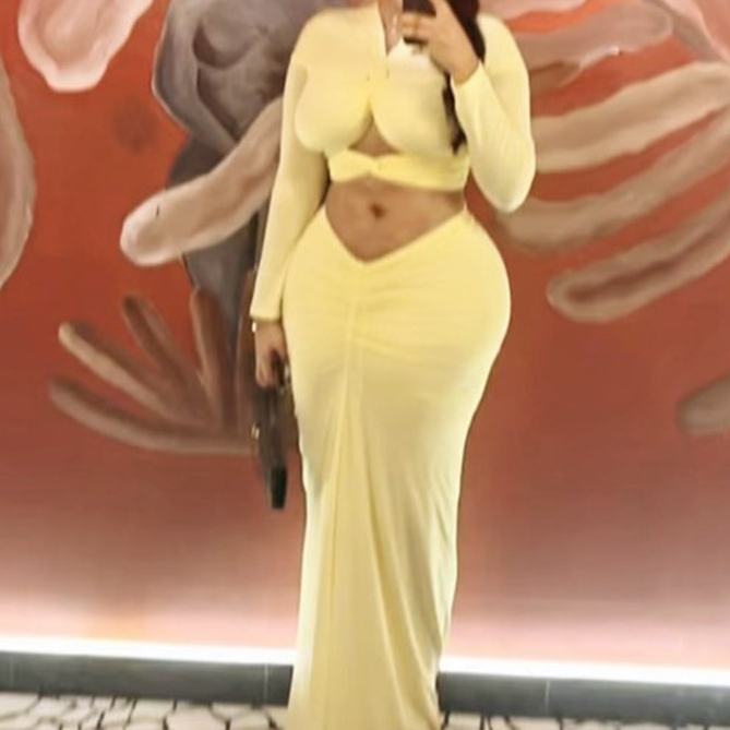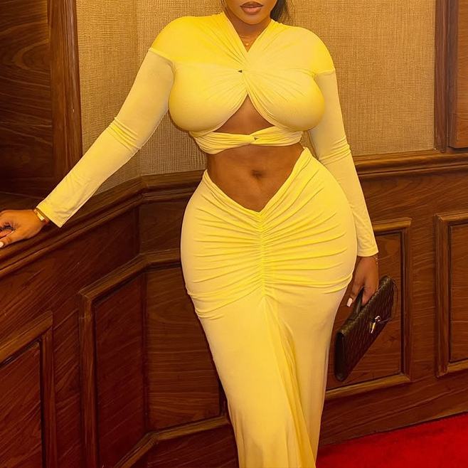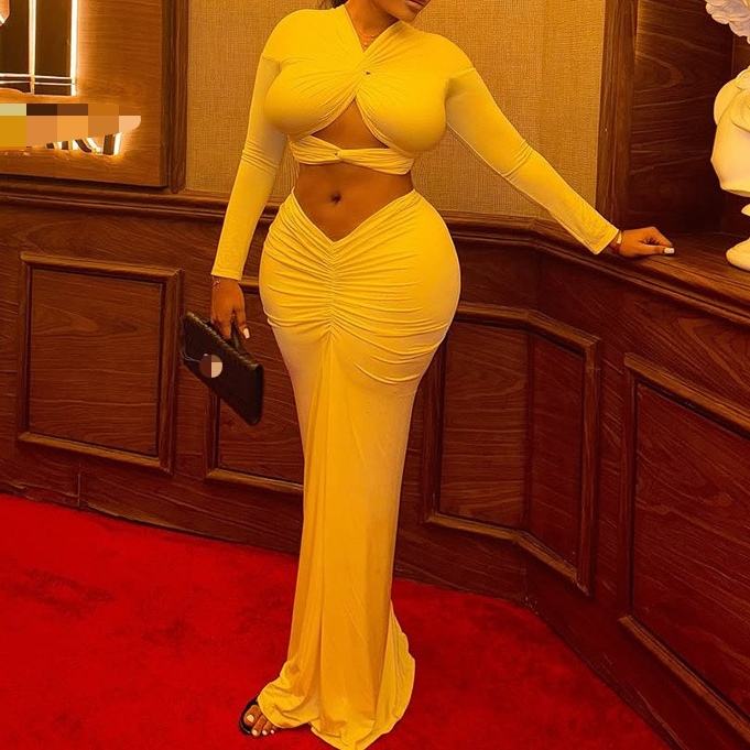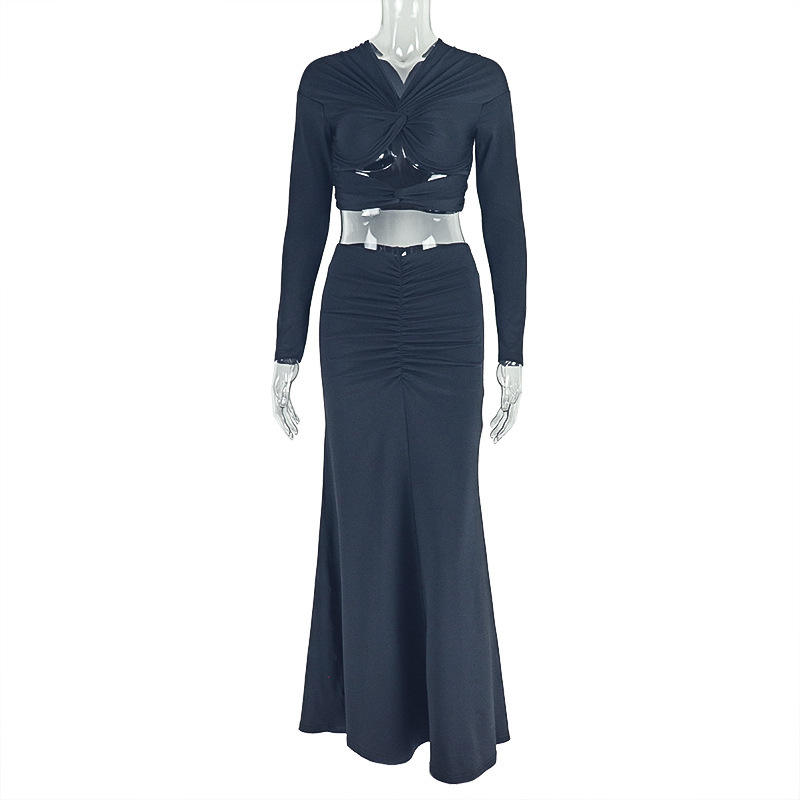 ชุดเซ็ตแฟชั่น 2 ชิ้น เสื้อครอปคอวีแขนยาวสีพื้นแต่งระบายผูกเชือก พร้อมกระโปรงทรงเข้ารูปสำหรับผู้หญิง