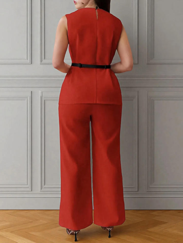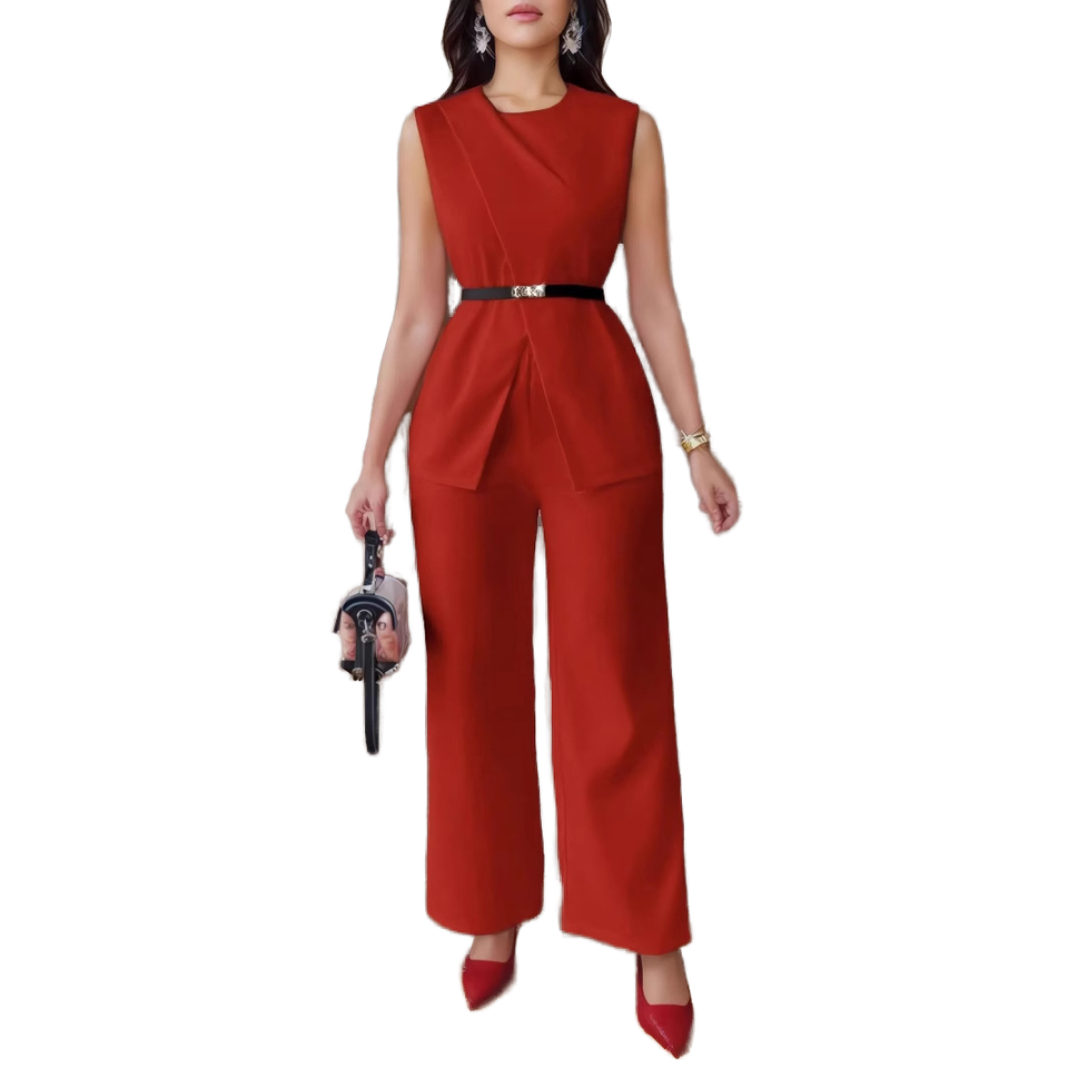 ชุดเซ็ต 2 ชิ้น เสื้อแขนกุดสีพื้นพร้อมเข็มขัดและกางเกงขายาวลำลองสำหรับผู้หญิง แฟชั่น