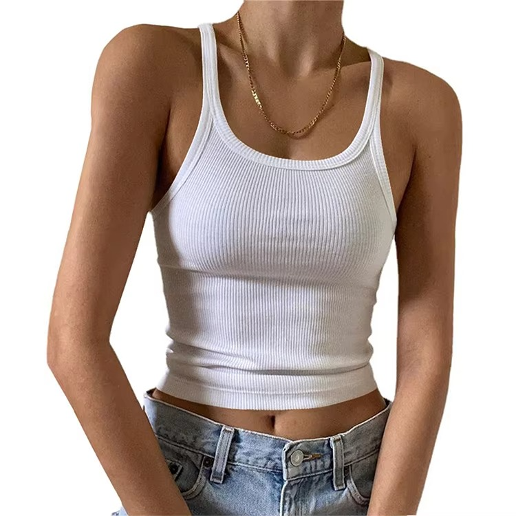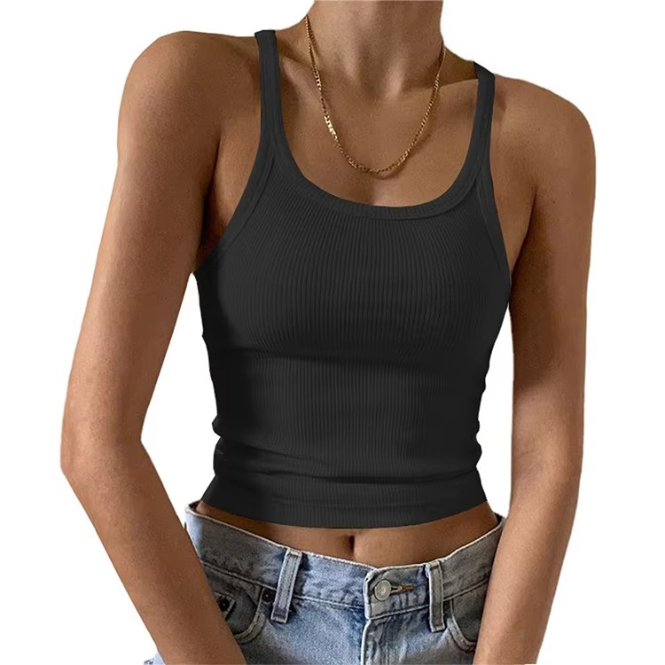 เสื้อกล้ามทรงเข้ารูปผ้าเดนิมผสมสแปนเด็กซ์/โพลีเอสเตอร์ คอโอ แขนกุด สีพื้น สำหรับผู้หญิง
