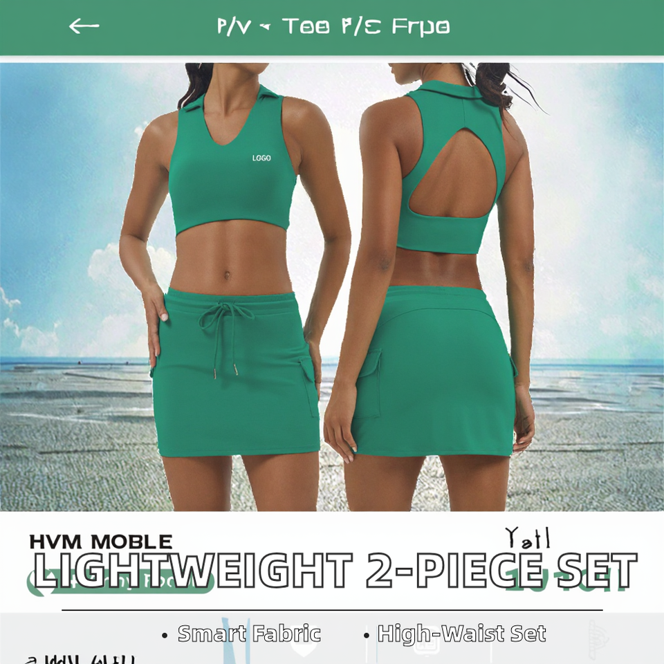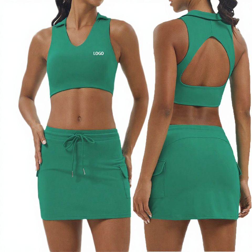 ชุดออกกำลังกายผู้หญิงแบบ 2 ชิ้น เสื้อชั้นในและกระโปรง ผ้าเนื้อบางเบา ระบายอากาศได้ดี มีเชือกผูกเอว กระเป๋าข้างสองชั้น ด้านหลังเว้า