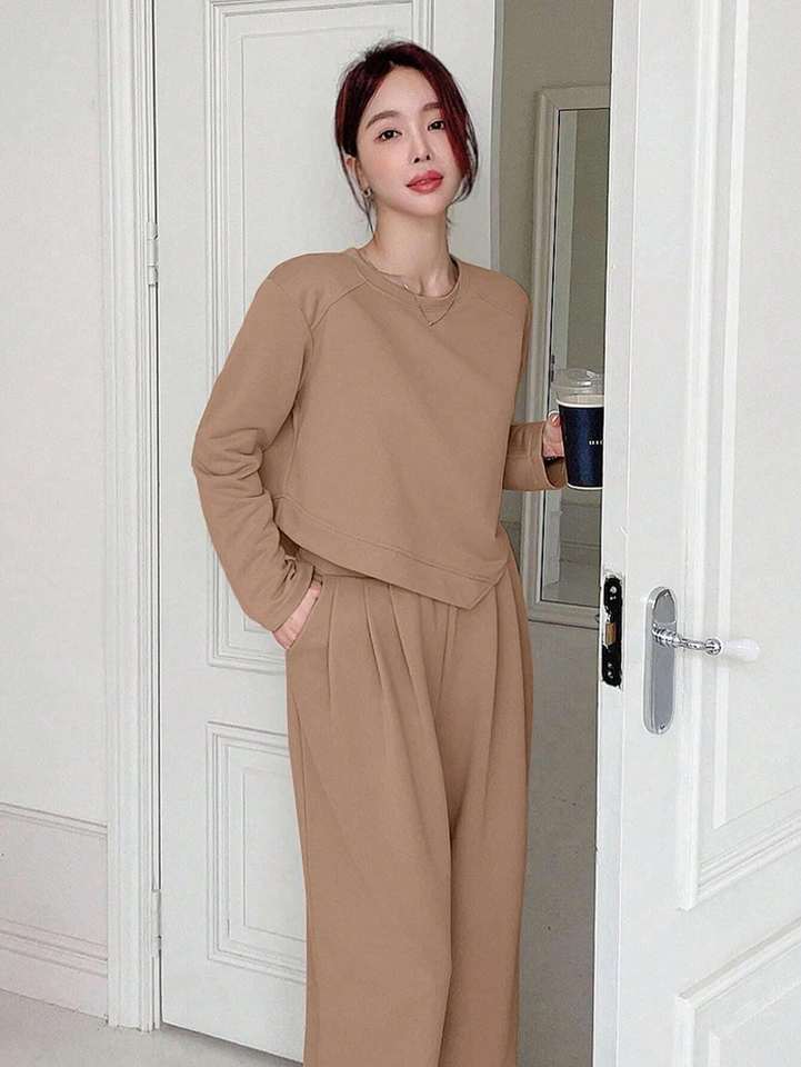 ชุดเซ็ตสองชิ้นสำหรับผู้หญิง ผ้าเนื้อดี เป็นมิตรกับสิ่งแวดล้อม เสื้อแขนยาวและกางเกงขายาวทรงกว้าง สวมใส่สบาย เข้าชุดกันอย่างลงตัว