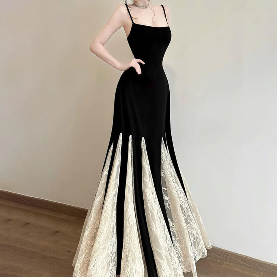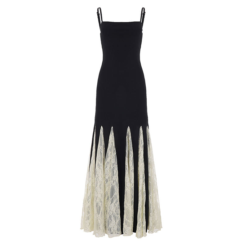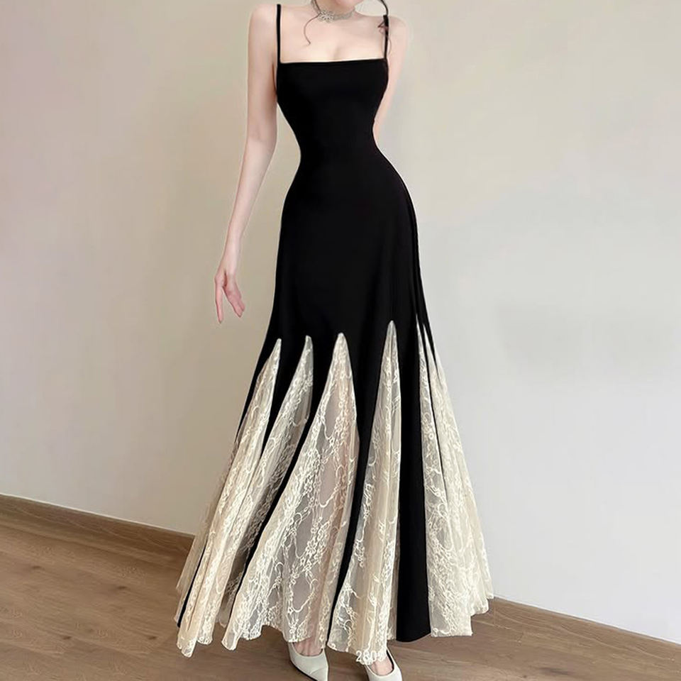 เดรสยาวทรงปล่อยสำหรับผู้หญิง ตกแต่งด้วยผ้าลูกไม้ ดีไซน์หรูหรา ช่วงเอวเข้ารูป พิมพ์ลายดิจิทัล ซักได้ ตัดต่อผ้าแบบไร้แขน