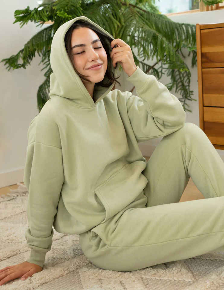 ชุดเซ็ตเสื้อฮู้ดและกางเกงจ็อกเกอร์ผ้าฟลีซแบบสองชิ้นสำหรับผู้หญิง สีพื้น เรียบง่าย เป็นมิตรกับสิ่งแวดล้อม เหมาะสำหรับใส่ลำลอง เล่นกีฬา หรือใส่ในชีวิตประจำวัน