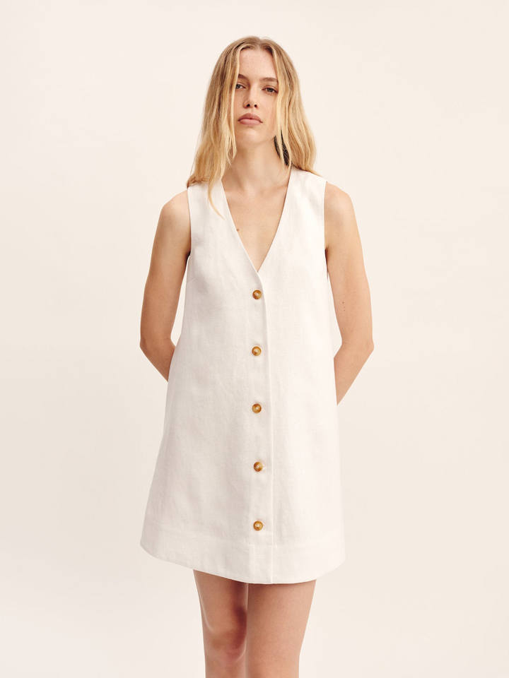 เดรสผ้าลินินสีขาวล้วนทรงเอไลน์ คอวี กระดุมผ่าหน้า ทรงเข้ารูป ระบายอากาศได้ดี สไตล์วินเทจฝรั่งเศส เอวธรรมชาติ สำหรับผู้หญิง ฤดูร้อน รับผลิตแบบ ODM