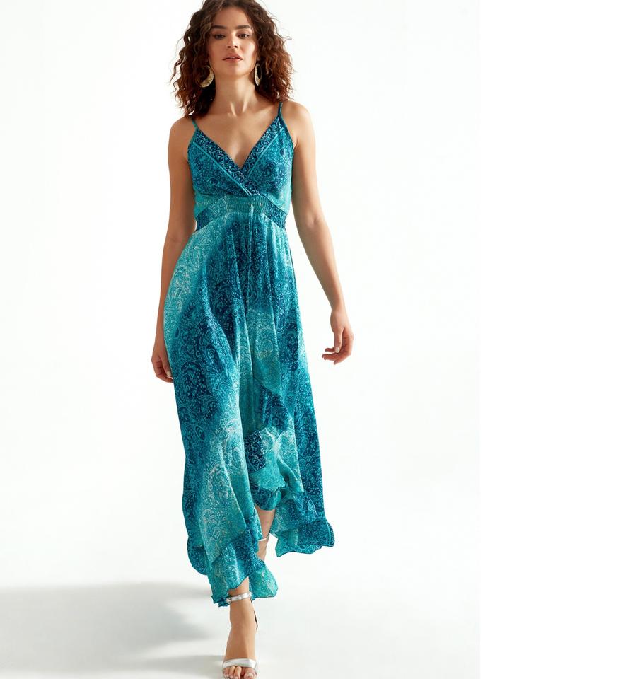 เดรสยาวสายเดี่ยวคอลึกทรงวีสำหรับผู้หญิง ลายดอกไม้ แต่งสม็อคด้านหลัง ผ้าพลิ้วไหว เหมาะสำหรับใส่ไปทะเลในฤดูร้อน มีหลายแบบให้เลือก