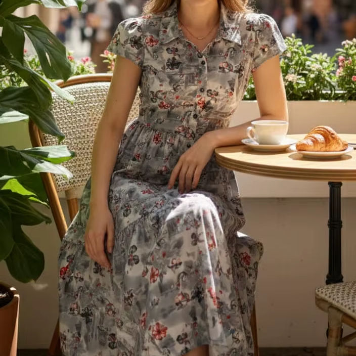 เดรสสายเดี่ยวผู้หญิง ลายอิกกัต ทรงพลิ้ว ยาวคลุมข้อเท้า สีน้ำเงิน สไตล์ลำลอง ติดกระดุม ระบายอากาศได้ดี ทรงเอ เอวธรรมชาติ เรียบง่าย 100%