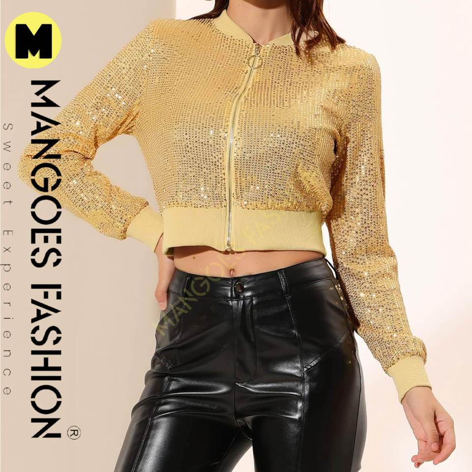เสื้อแจ็คเก็ตผู้หญิงผ้าแคนวาสระบายอากาศได้ดี ประดับกลิตเตอร์สีเหลืองวิบวับ แต่งเลื่อมแบบควิลท์ ทรงครอป ซิปหน้า สไตล์บอมเบอร์ สำหรับลุคแฟชั่นสุดชิคและมีเสน่ห์