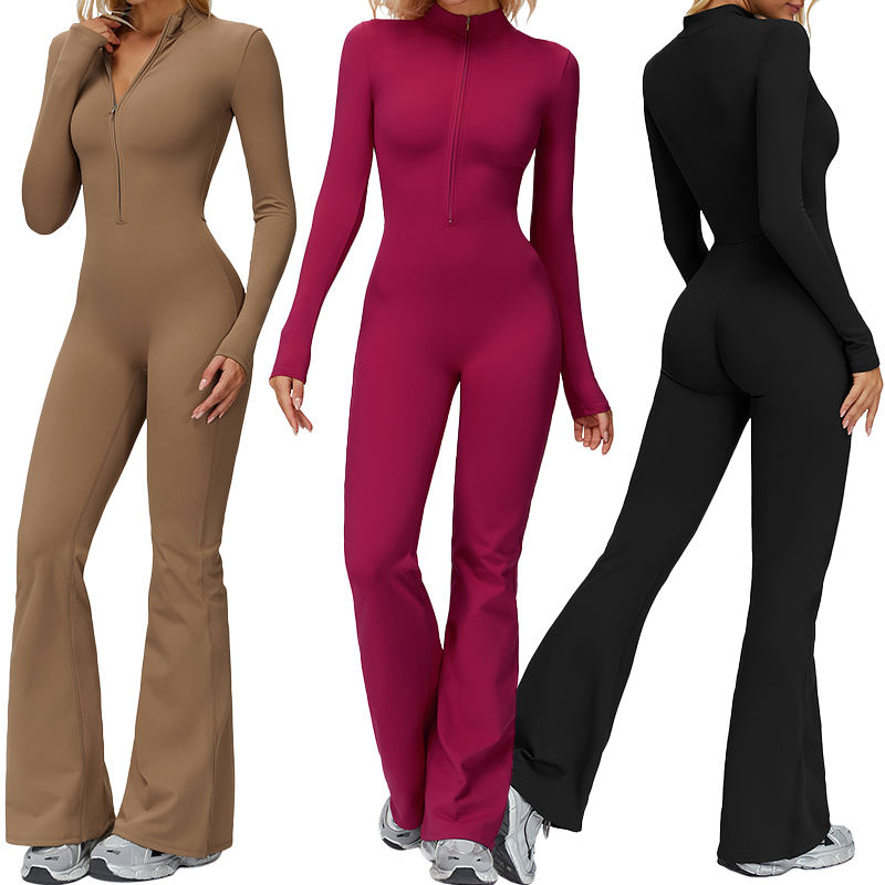 ชุดจั๊มสูทกีฬาผู้หญิง แขนยาว อุ่นสบาย ชุดโยคะแบบชิ้นเดียว ชุดออกกำลังกายแบบยืดหยุ่น กางเกงขาบาน ชุดลำลอง