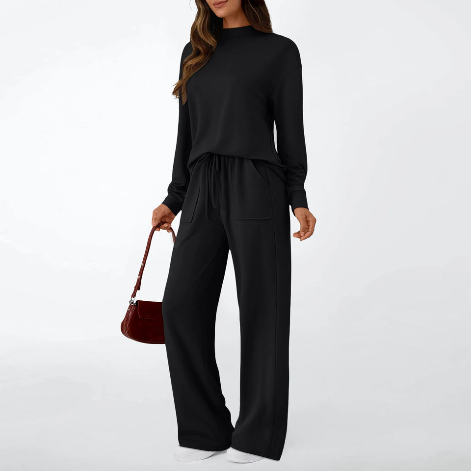 ชุดเซ็ต 2 ชิ้นสำหรับผู้หญิง ฤดูใบไม้ผลิ/ฤดูใบไม้ร่วง เสื้อแขนยาวคอกลมจีบระบาย และกางเกงขายาวเอวยางยืด สวมใส่สบายๆ