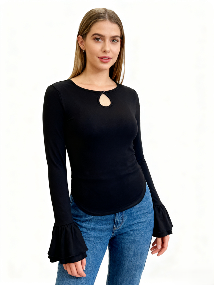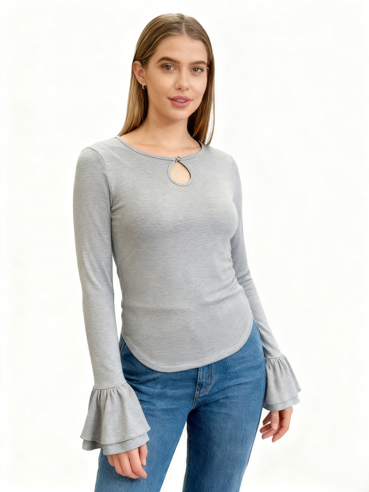เสื้อยืดแฟชั่นผู้หญิง แขนกระดิ่งคู่ ทรงเข้ารูป ดีไซน์เว้าหลัง ผ้าถักนุ่ม ยืดหยุ่น คุณภาพสูง สำหรับฤดูใบไม้ผลิ/ฤดูใบไม้ร่วง