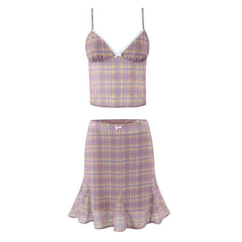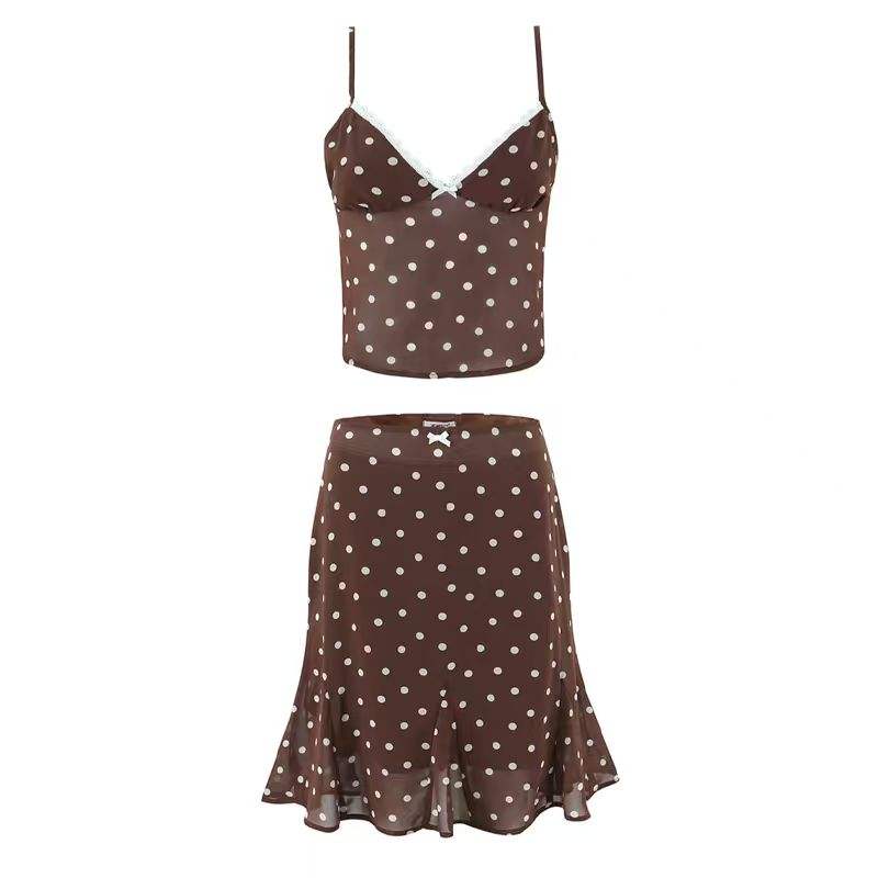ชุดเซ็ตเสื้อสายเดี่ยวผ้าลูกไม้ถักแบบเปิดหลังสุดเซ็กซี่และกระโปรงระบายพิมพ์ลายดิจิทัลสำหรับผู้หญิงแฟชั่นใหม่รับฤดูใบไม้ผลิ เหมาะสำหรับใส่ในชีวิตประจำวัน