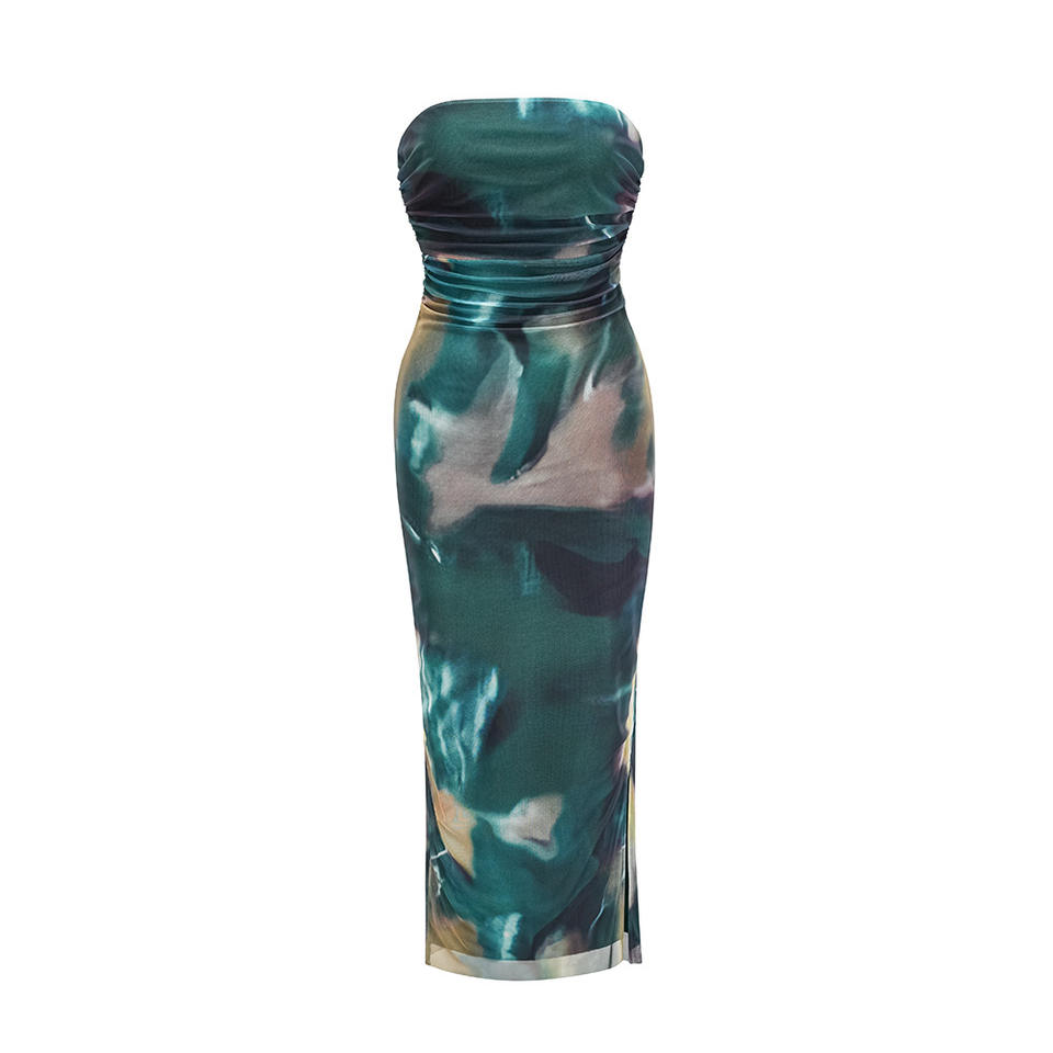 เดรสผ้าตาข่ายพิมพ์ลายสองชั้นผ่าข้างเซ็กซี่สำหรับผู้หญิงคอลเลคชั่นใหม่ฤดูใบไม้ผลิ/ฤดูร้อน ขายส่งแฟชั่น