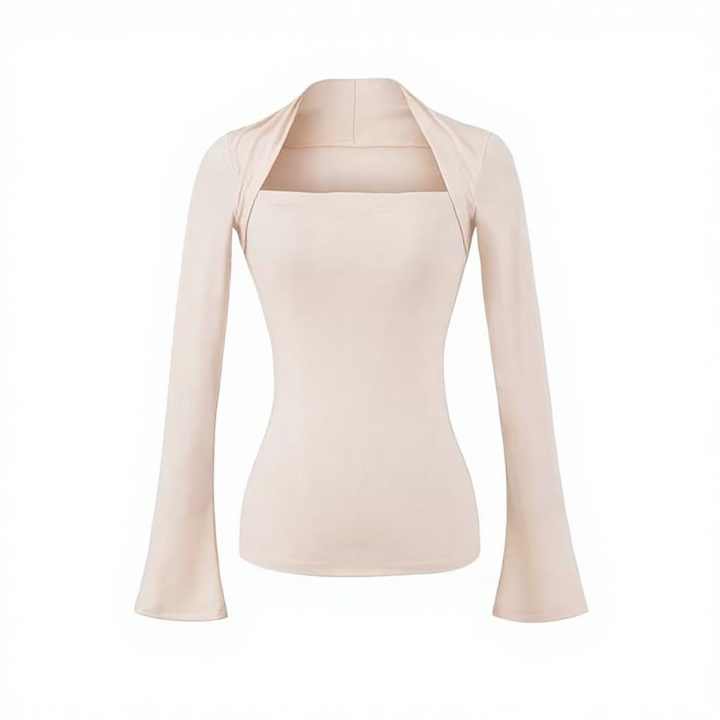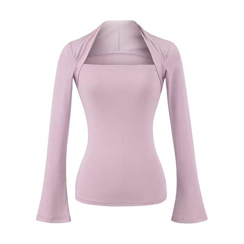 เสื้อยืดแขนยาวคอเหลี่ยมทรงสลิมสีพื้นสไตล์ลำลองสำหรับผู้หญิงช่วงฤดูใบไม้ร่วงพร้อมแขนบาน