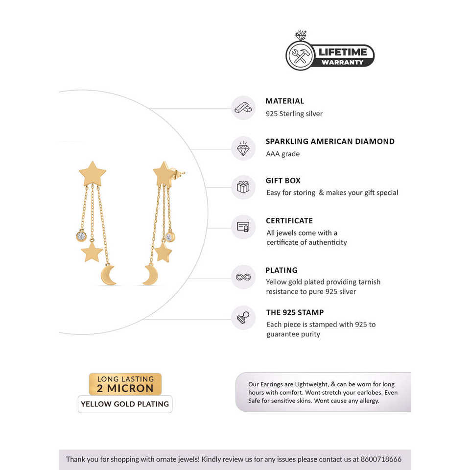 ต่างหูเพชรรูปดาวและพระจันทร์สำหรับผู้หญิง ชุบทองคำเหลือง 5.55 กรัม