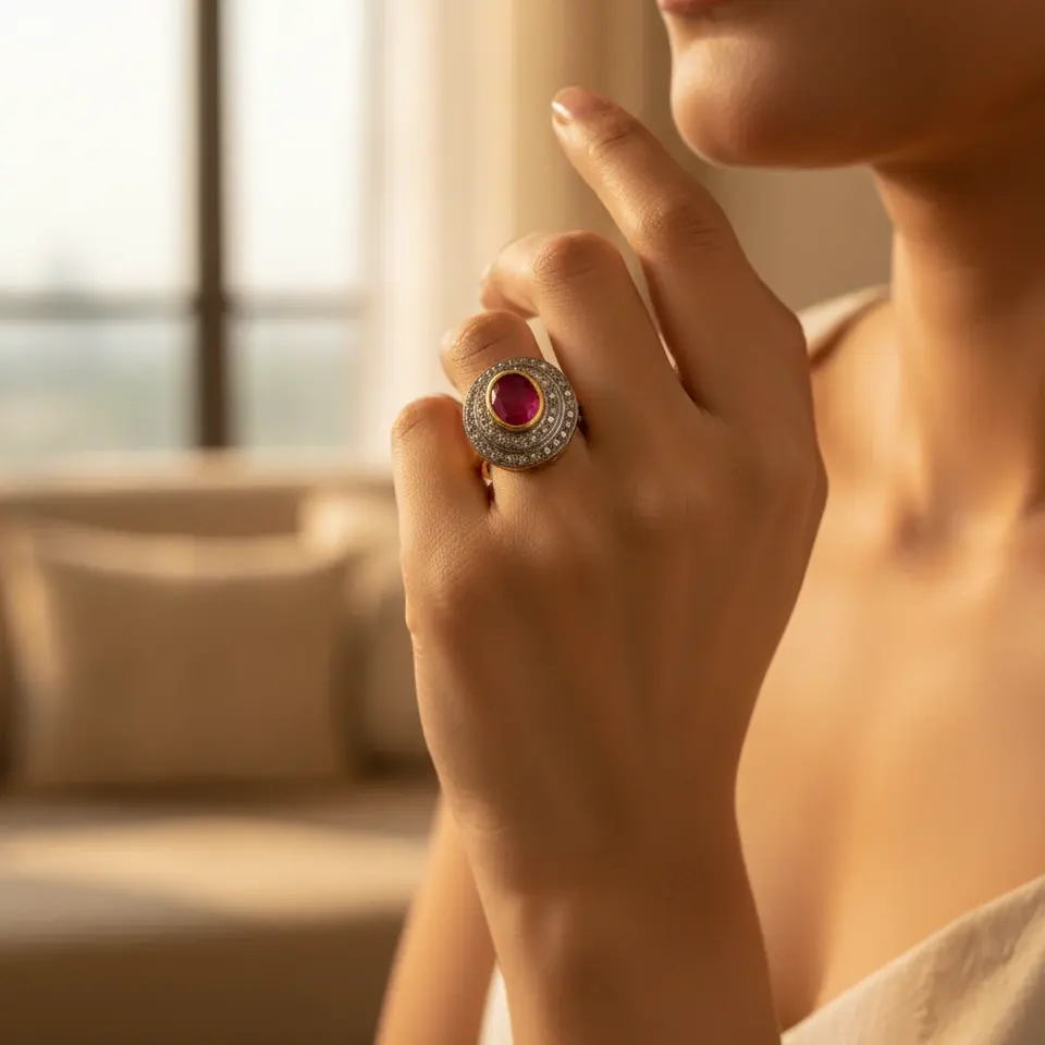 แหวนพลอยทับทิมสำหรับผู้หญิง ชุบทอง ประดับพลอย พร้อมชุบแพลตตินัม โรเดียม