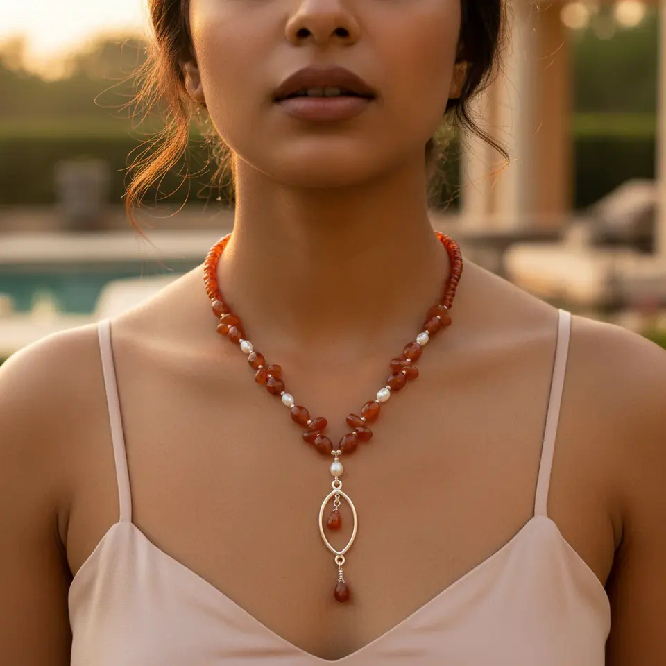 สร้อยคอเงินแท้ประดับพลอยคาร์เนเลียนสำหรับผู้หญิง พร้อมไข่มุก ดีไซน์หรูหรา เหมาะเป็นของขวัญ