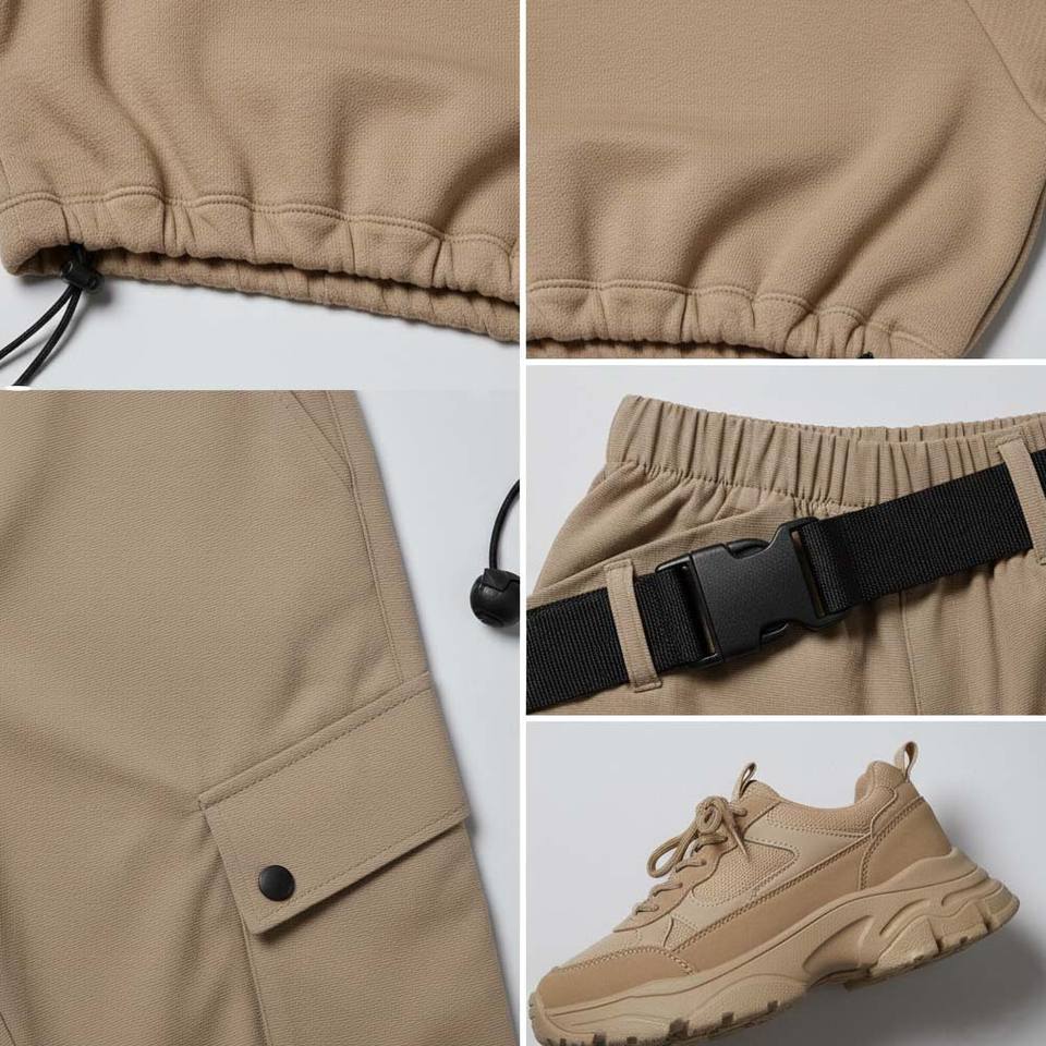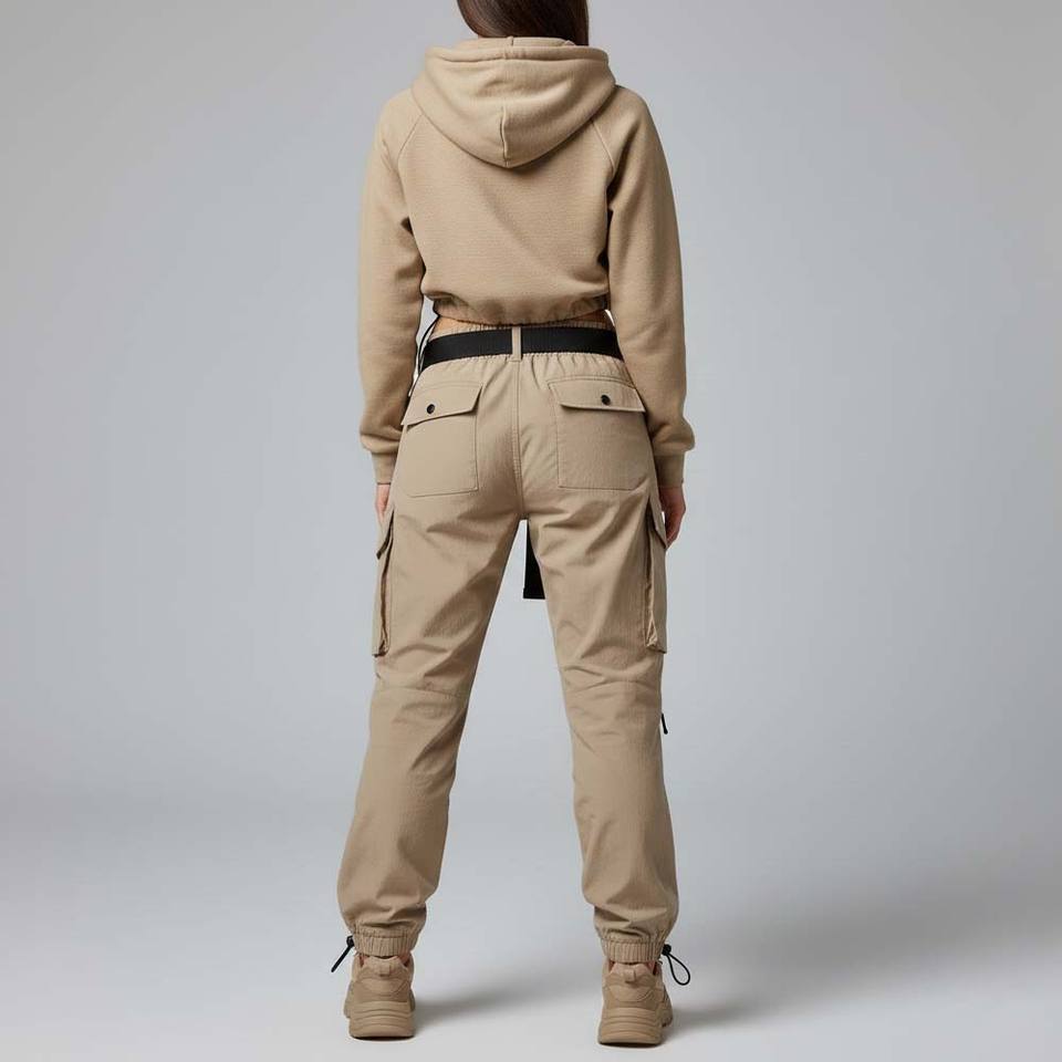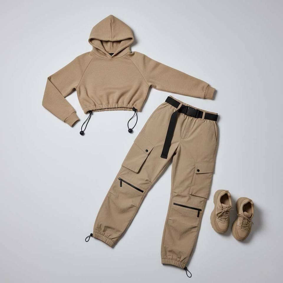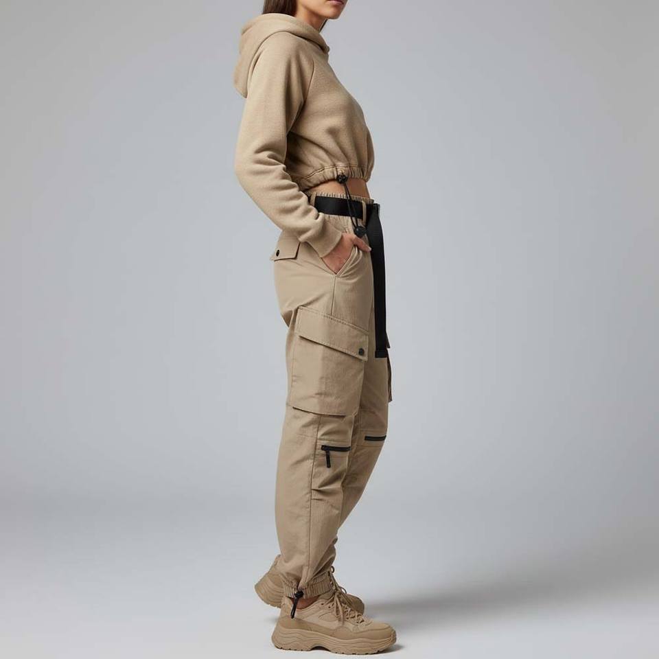 ชุดเซ็ตเสื้อผ้าสตรีแนวสตรีท สีพื้น แบบสองชิ้น เสื้อฮู้ดครอปเอวเข้ารูป กางเกงคาร์โก้ทรงพาราชูท ผ้ากำมะหยี่ 100% ผ้าฝ้าย