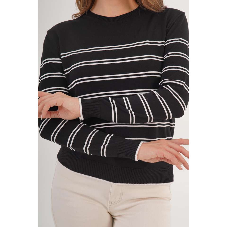 เสื้อสเวตเตอร์ไหมพรมคอกลมลายทางสำหรับผู้หญิง สีดำ แขนยาว สวมใส่สบาย ไม่เป็นขุย 14 กรัม
