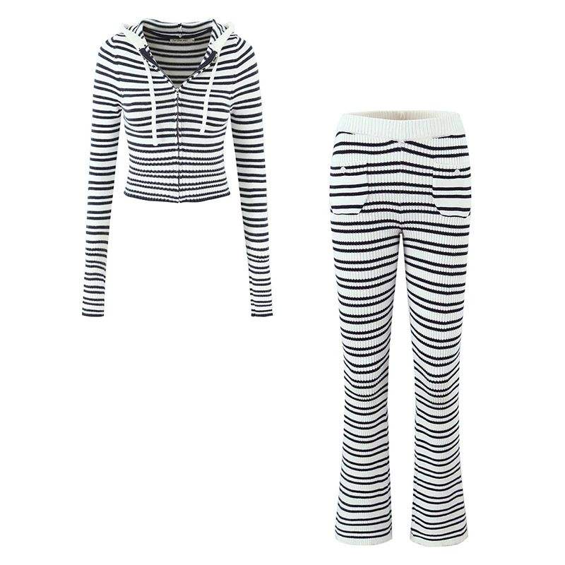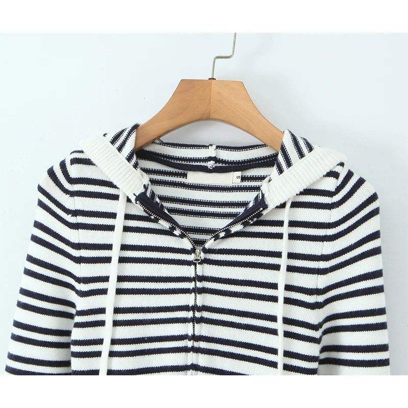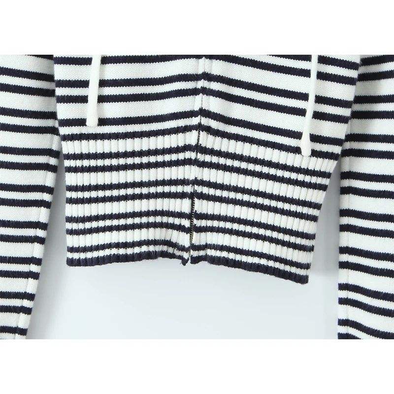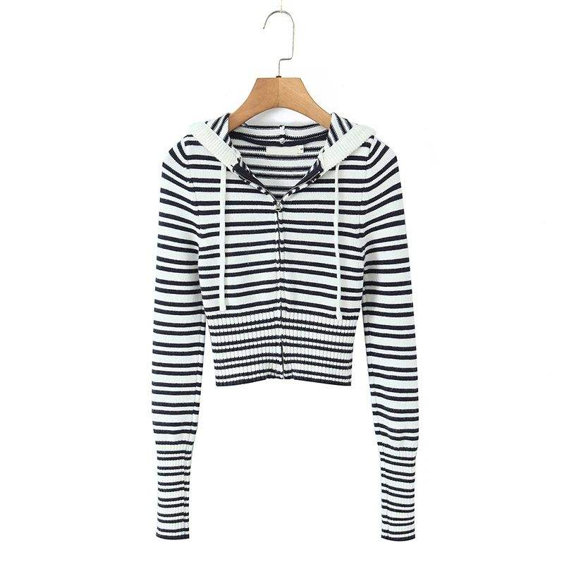 เสื้อสเวตเตอร์มีฮู้ดลายทางถักด้านหน้ามีซิปแขนยาวเสื้อครอปเข้ารูปสำหรับฤดูใบไม้ร่วง