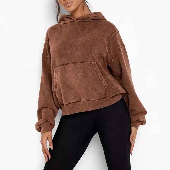 เสื้อฮู้ดผู้หญิงสไตล์ลำลอง ทรงหลวม สีพื้น ผ้าฟลีซ ซักย้อมสีแบบแอซิดวอช แขนยาว ผ้าฝ้าย 100% เหมาะสำหรับฤดูหนาว