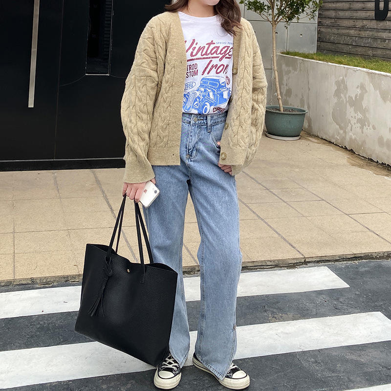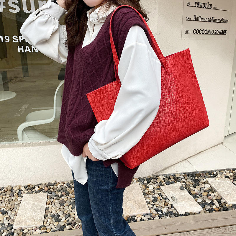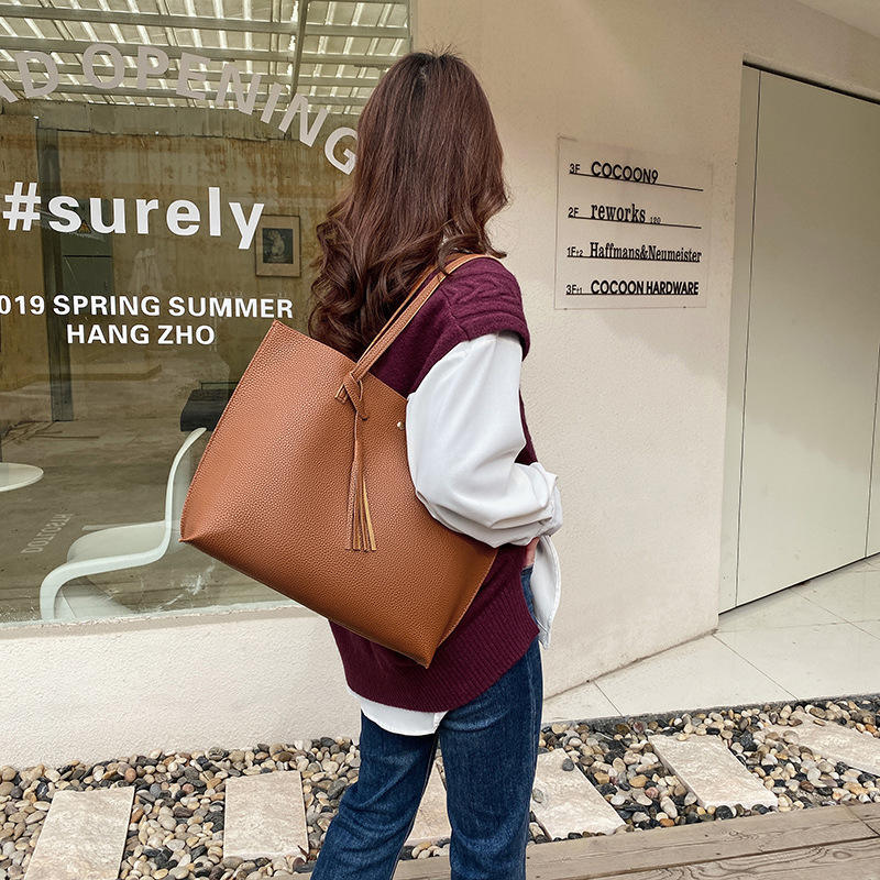 กระเป๋าถือทรงถังสำหรับผู้หญิง ลายลิ้นจี่ แต่งพู่เก๋ไก๋ ทันสมัย จุของได้เยอะ ผลิตจากวัสดุ PU ใช้ได้ทุกฤดู
