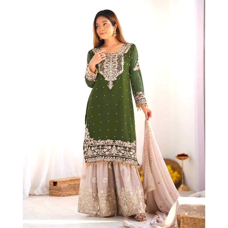 ชุดสูทผู้หญิงปักลายหนัก พร้อมงานปักดิ้นดอริ-ซีเควนซ์ ท็อป-กางเกง และผ้าคลุมไหล่
