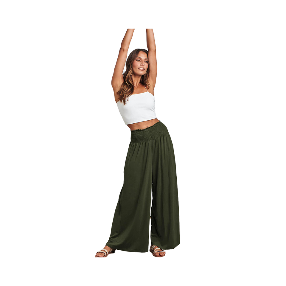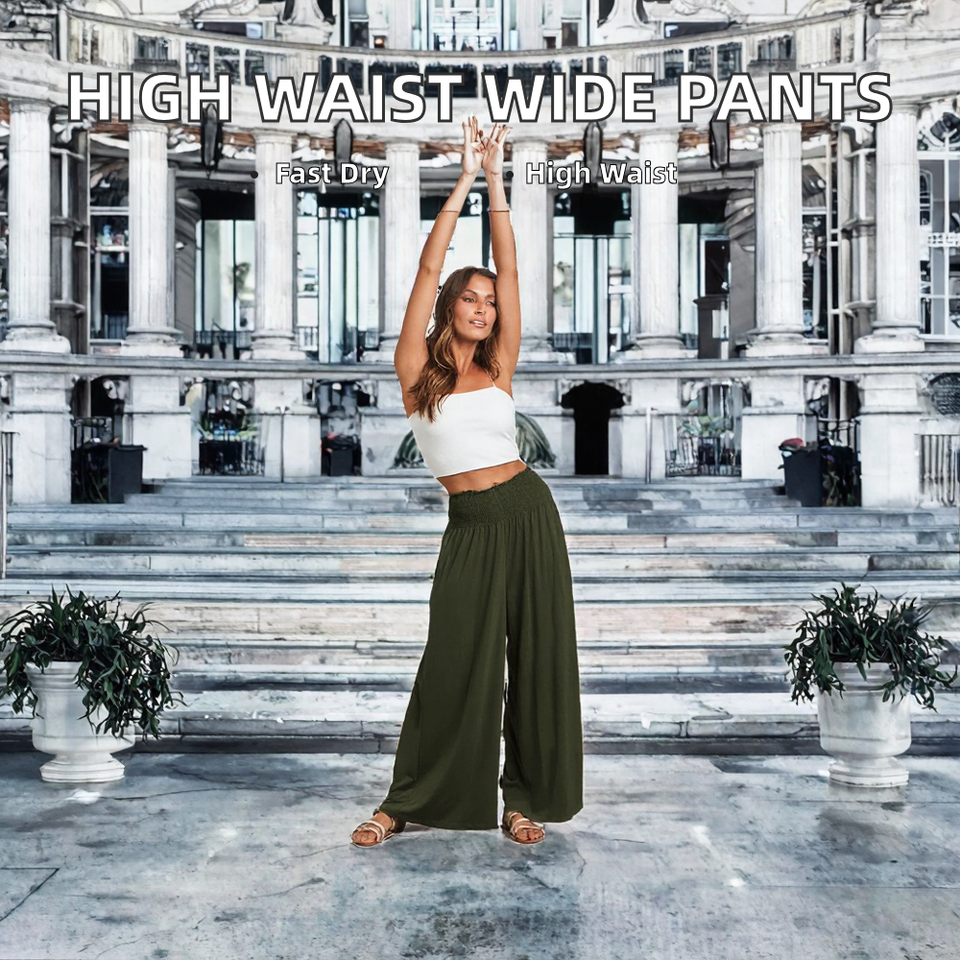 กางเกงขายาวทรงตรงเอวสูงลำลองสำหรับผู้หญิงใส่หน้าร้อน เอวยางยืด แห้งเร็ว ผลิตจากผ้าสแปนเด็กซ์/โพลีเอสเตอร์