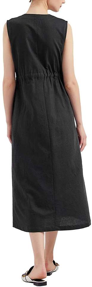 ชุดเดรสผ้าซาตินปักลายดอกไม้คอวีมีซิปผ้าลินินเอวธรรมชาติลำลองฤดูร้อน