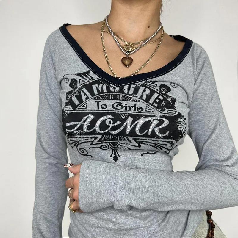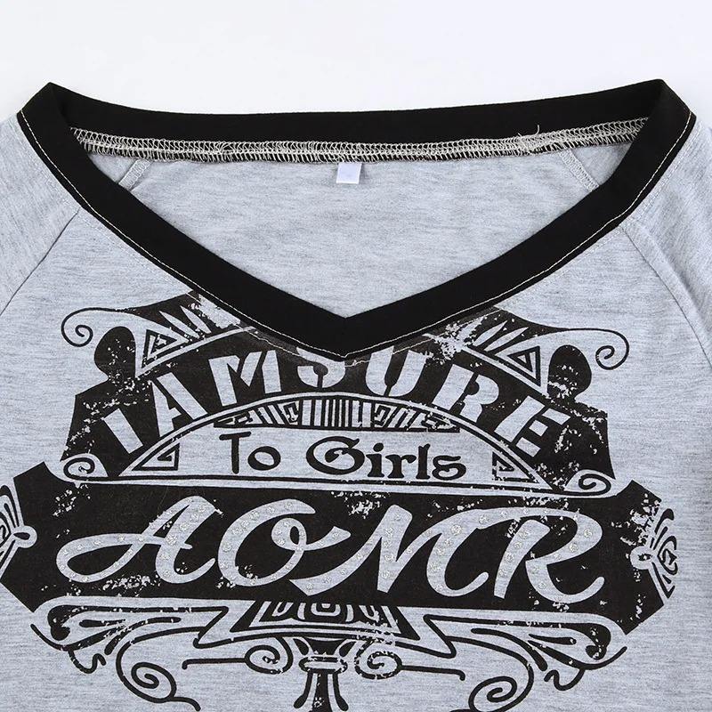 เสื้อยืดคอวีแขนยาวสำหรับผู้หญิงใส่ในฤดูร้อนเสื้อยืดแฟชั่นลำลองปักลายผ้าถักสีเทาสไตล์สตรีทแวร์