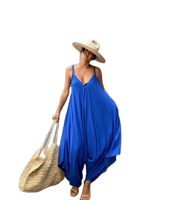 จั๊มสูทแขนกุดลำลองหรูหราสำหรับผู้หญิงใส่ในฤดูร้อนดีไซน์คอวีแนวโบฮีเมียนสไตล์เรียบง่ายสั่งตามสั่ง