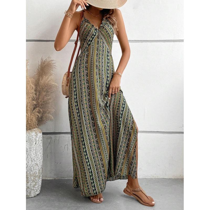 เดรสผ่าตรงต้นขาเปลือยหลังลายชนเผ่าสำหรับผู้หญิงเสื้อผ้าฤดูร้อนเดรสยาวแต่งขอบแบบโบฮีเมียนแฟชั่นสำหรับเดินชายหาด