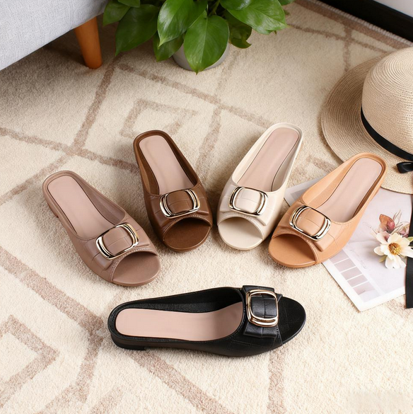 รองเท้าแตะส้นหนาแบบสวมลำลองสำหรับผู้หญิง สไตล์สปริง/ซัมเมอร์ ประดับหัวเข็มขัดสี่เหลี่ยม