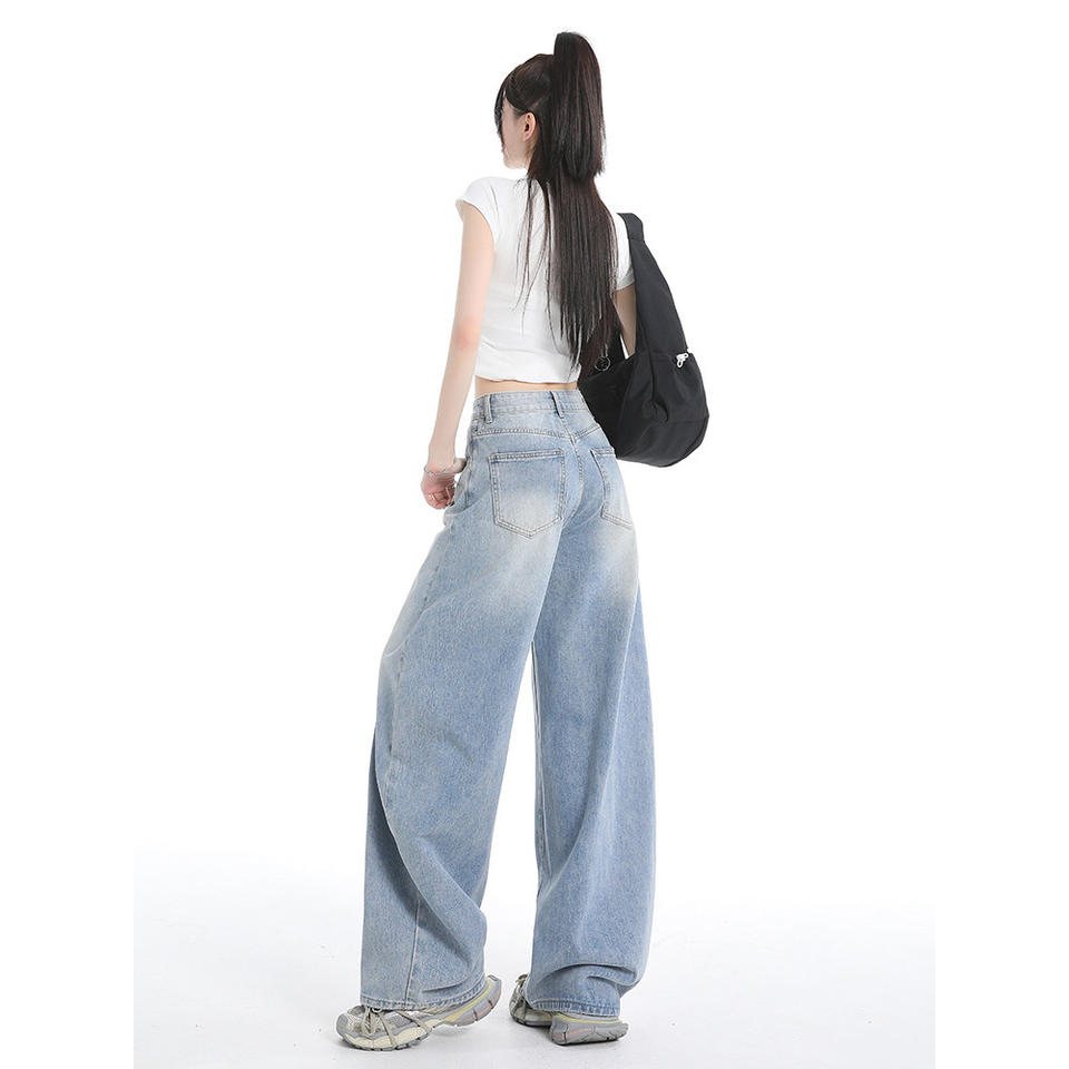 กางเกงยีนส์เอวสูงสีฟ้าอ่อนทรงตรงขาบานสไตล์สกิมิทาร์สำหรับผู้หญิงช่วงฤดูร้อน