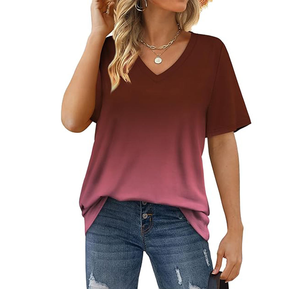เสื้อยืดแขนสั้นคอวีระบายได้ดีสำหรับผู้หญิงเสื้อยืดปักลายผ้าแคนวาสระบายอากาศได้ดีสีเบอร์กันดีฤดูร้อน