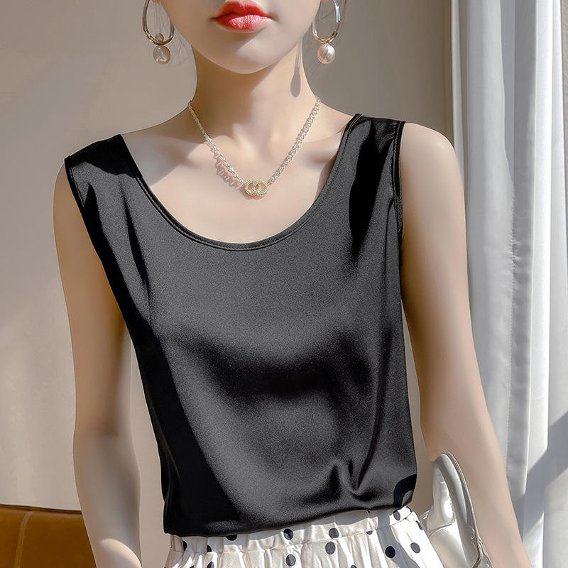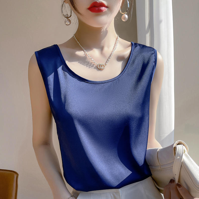 เสื้อกล้ามผ้าซาตินสำหรับผู้หญิง คอกลม ทรงหลวม ใส่สบาย เหมาะสำหรับใส่ลำลองช่วงฤดูร้อน