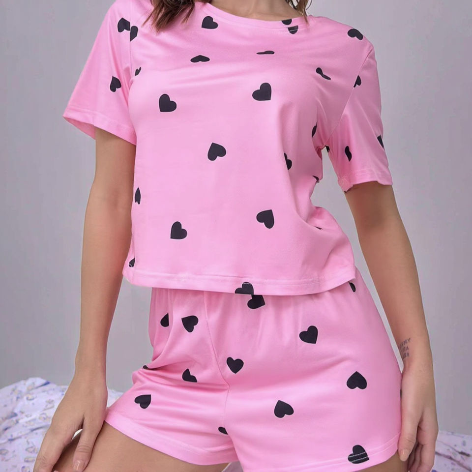 ชุดนอนฤดูร้อนของผู้หญิงคอกลมพิมพ์ลายสีชมพูชุดลำลองแขนสั้นเอวยางยืดระบายอากาศได้นุ่มสบายชุดโพลีเอสเตอร์