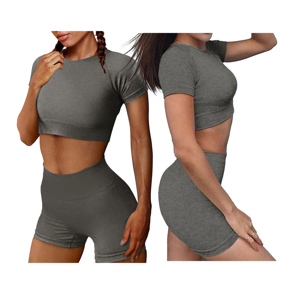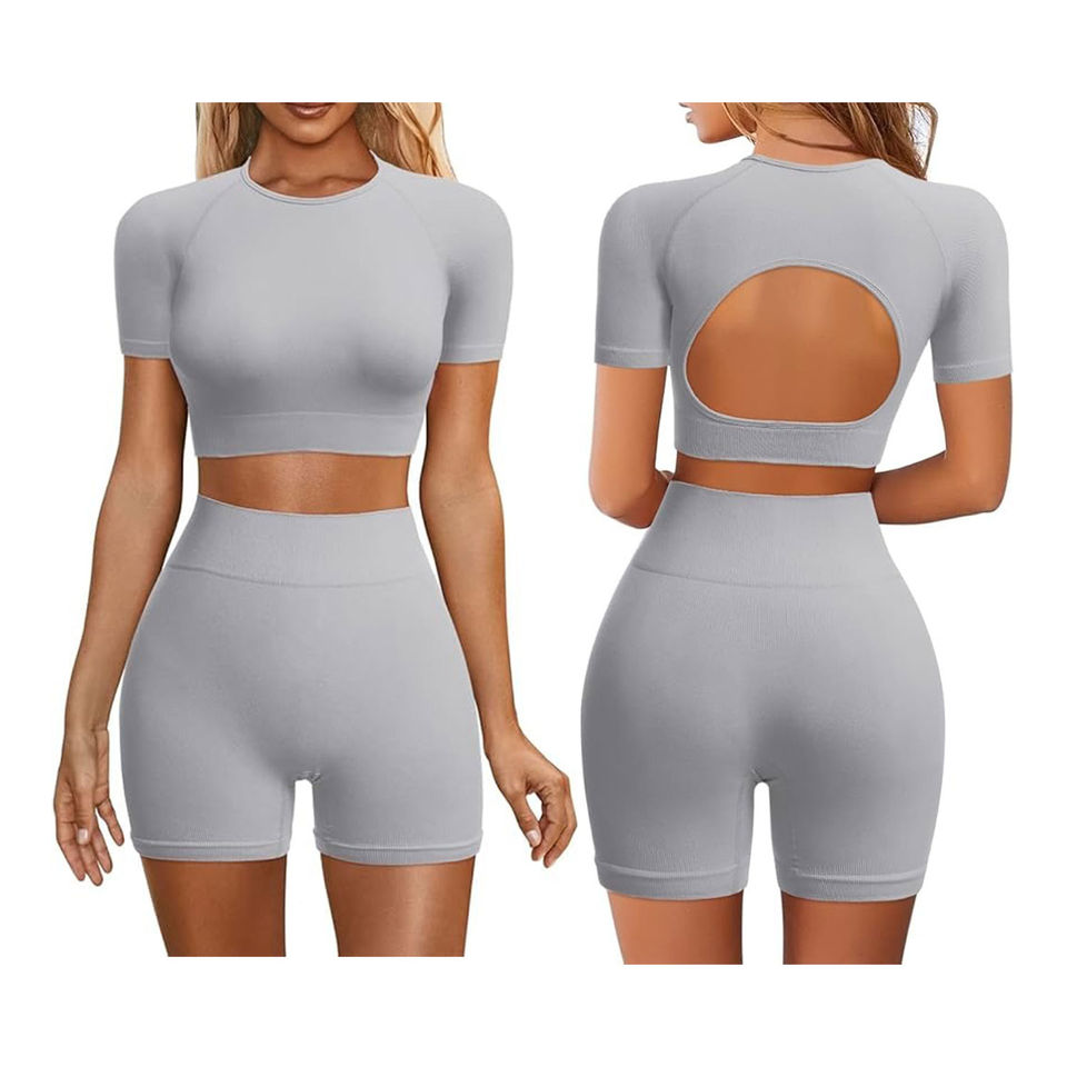 ชุดโยคะสองชิ้นสำหรับผู้หญิง เสื้อครอปและกางเกงขาสั้น ผ้าระบายอากาศดี ความยาวเหนือเข่า คุณภาพสูง ราคาถูก รับผลิตตามแบบ OEM