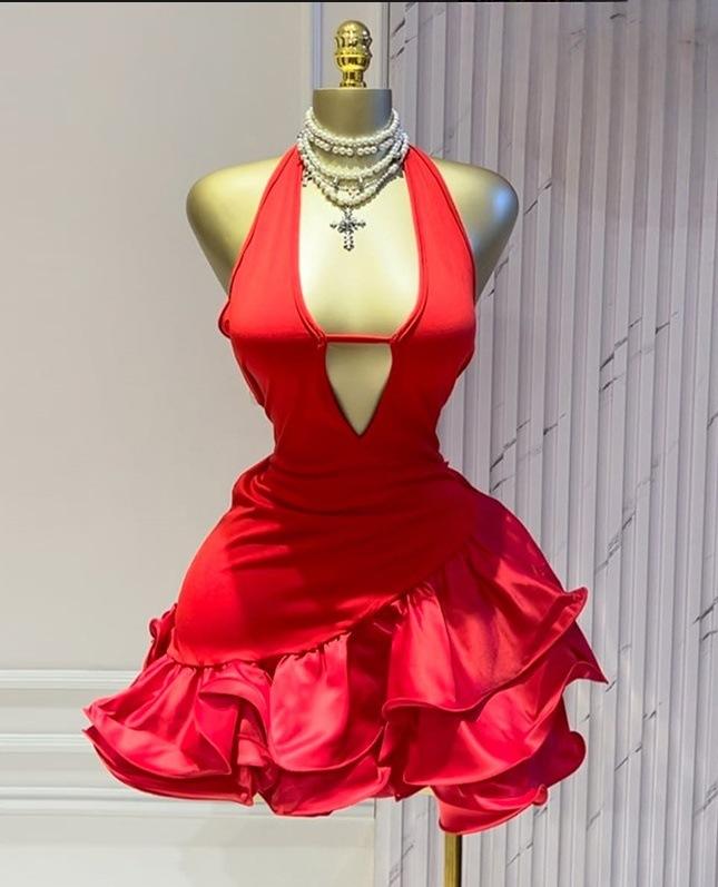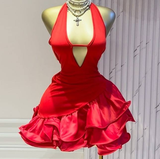 เดรสแฟชั่นผู้หญิงสำหรับฤดูร้อน ดีไซน์หวานสดใส คอวีลึก สายคล้องคอ เปิดหลัง ไม่มีแขน แต่งระบาย