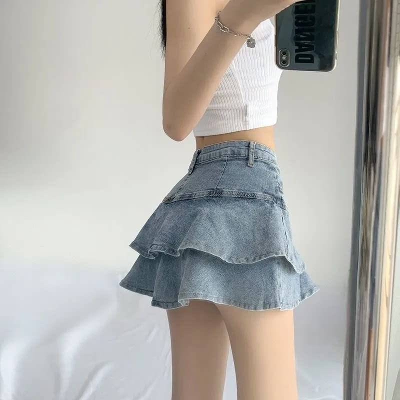 กระโปรงผ้ายีนส์เอวสูงผ้ายีนส์ทรงสลิมลำลองฟอกวินเทจฤดูร้อน