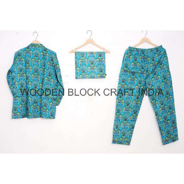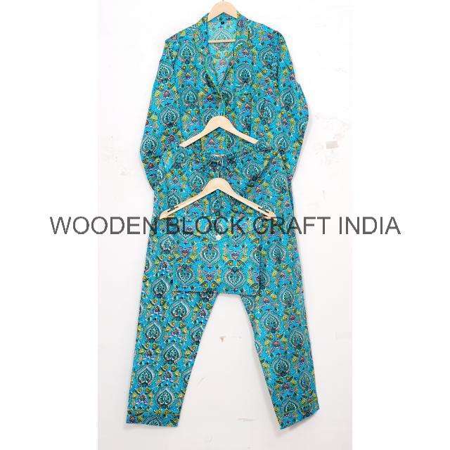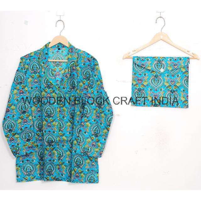 ชุดนอนผู้หญิงลายพิมพ์บล็อกมือทำ ผ้าฝ้ายเนื้อนุ่ม ใส่สบายสำหรับฤดูร้อน พร้อมคุณสมบัติเก็บความร้อน ทำด้วยมือสำหรับผู้หญิง