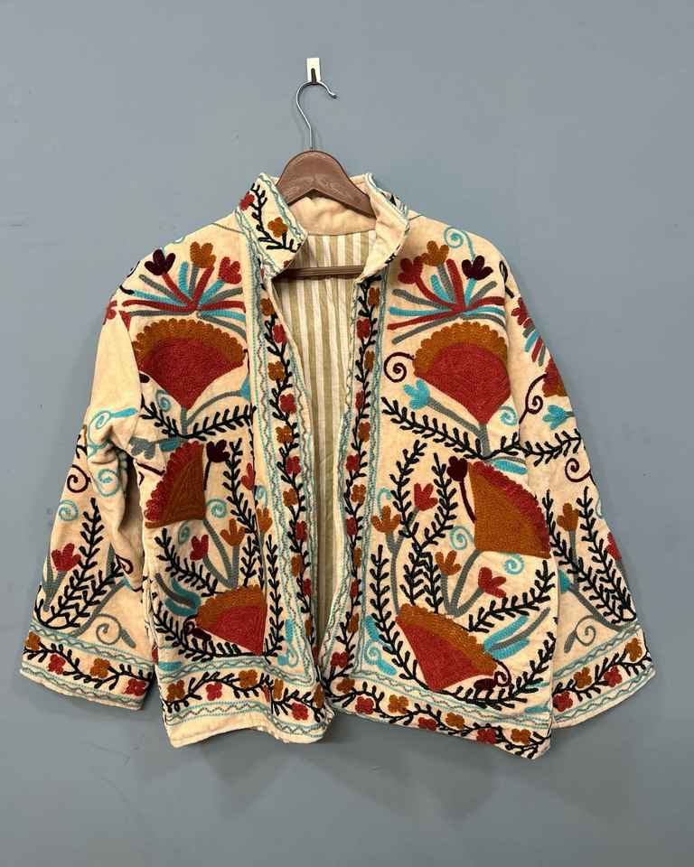 Suzani เสื้อแจ็กเก็ตปักลายกำมะหยี่, เสื้อโค้ท suzani ผ้าฝ้ายสีเขียวปักด้วยมือลายดอกไม้สำหรับฤดูใบไม้ร่วง