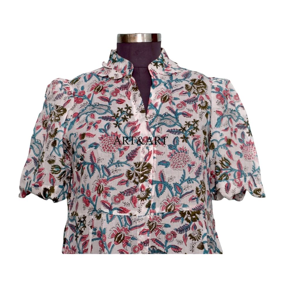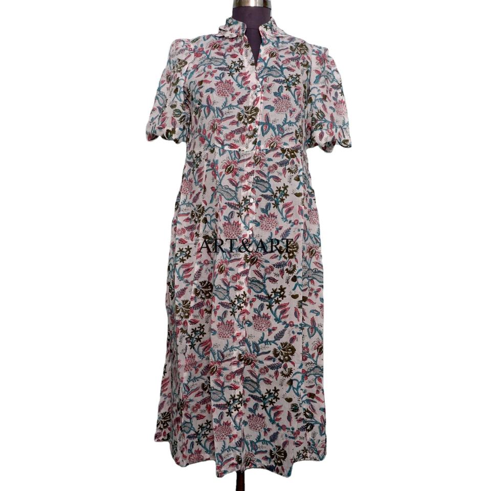 เดรสผู้หญิงสไตล์วินเทจหวานๆ ลำลอง ผ้าฝ้ายแท้ 100% แขนสั้น ความยาวปานกลาง ลายพิมพ์ดอกไม้ คอวี ติดกระดุม ทรงเอไลน์ ผ้าทอ