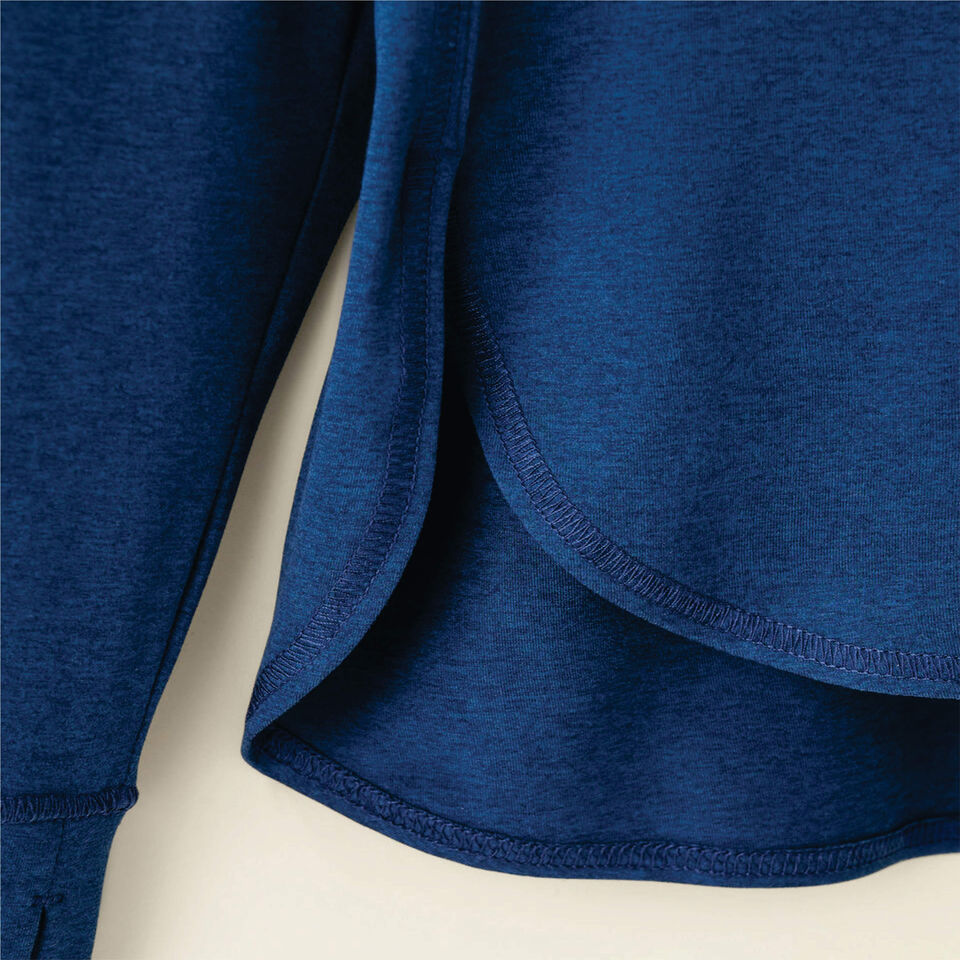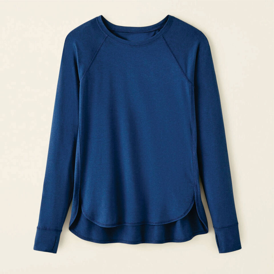 เสื้อกีฬาแขนยาวผ้าคอตตอนโพลีเอสเตอร์หลวมเข้ารูปเสื้อคอกลมสีทึบป้องกันริ้วรอยคอเสื้อของผู้หญิง